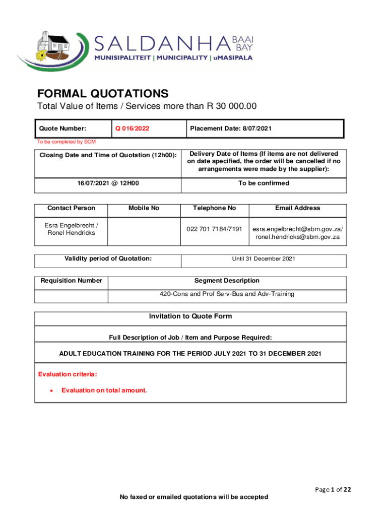Quote Number:Q 016/2022Placement Date: 8/07/2021To be completed by Closing Date and Time of Quotation (12h00):Delivery Date