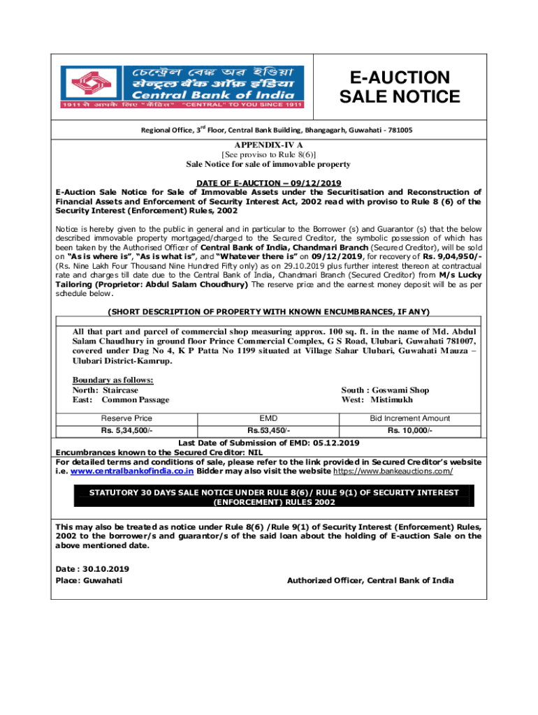 AUCTION SALE NOTICE regional Office, 3 Floor, Central Bank Building, Chandigarh, Guwahati 781005APPENDIXIV A [See proviso to Rule 8(6)] Sale Notice for sale of immovable property DATE OF AUCTION 09/12/2019