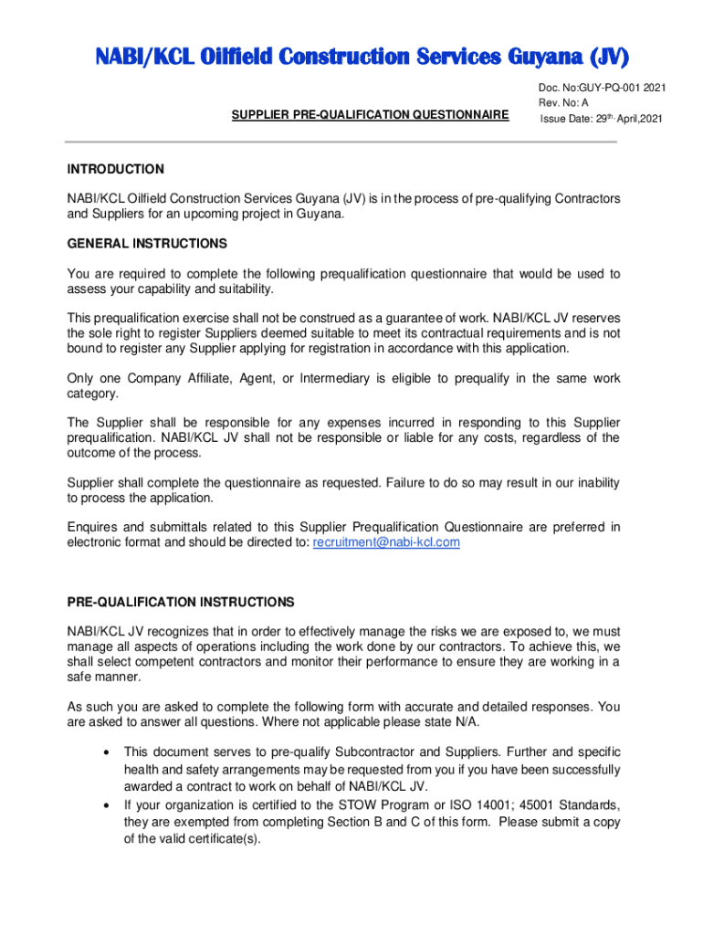 NAZI/KCL Oilfield Construction Services Guyana (JV) SUPPLIER PREQUALIFICATION Questionnaire. No:GUYPQ001 2021 Rev. No: A Issue Date: 29th, April,2021INTRODUCTION NAZI/KCL Oilfield Construction Services