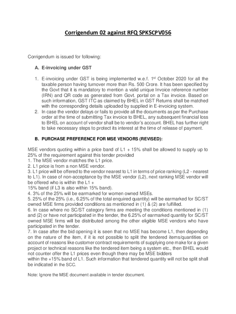 Corrigendum 02 against RFQ SPKSCPV056Corrigendum is issued for following: A. Invoicing under GST 1. Invoicing under GST is being implemented w.e.f. 1st October 2020 for all the taxable person having