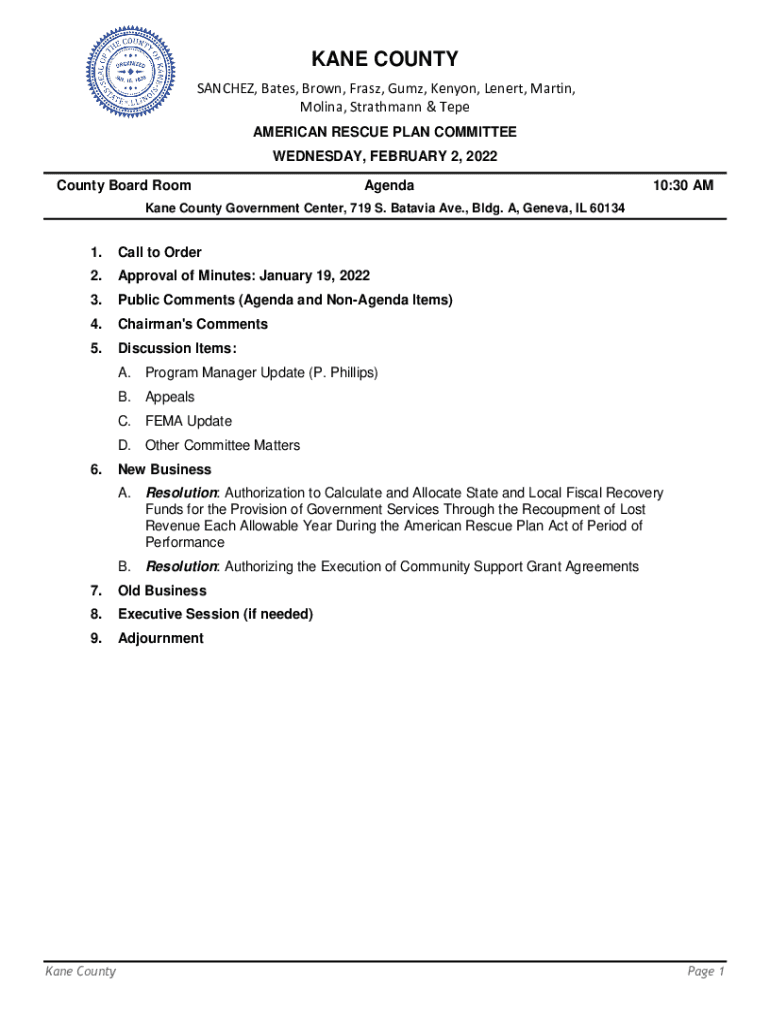 KANE COUNTY SANCHEZ, Bates, Brown, Franz, Gum, Kenyon, Desert, Martin, Molina, Strathmann & Type AMERICAN RESCUE PLAN COMMITTEE WEDNESDAY, FEBRUARY 2, 2022, County Board RoomAgenda10:30 AM Kane County