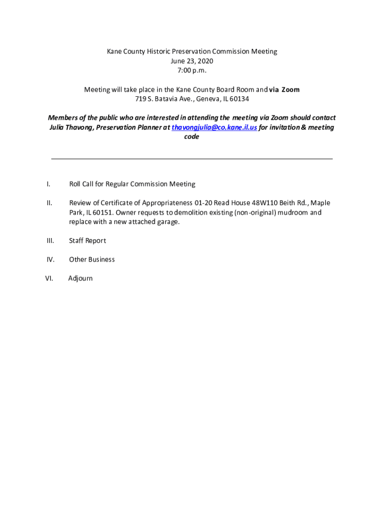 Kane County Historic Preservation Commission Meeting June 23, 2020 7:00 p.m. Meeting will take place in the Kane County Board Room and via Zoom 719 S. Batavia Ave., Geneva, IL 60134 Members of the