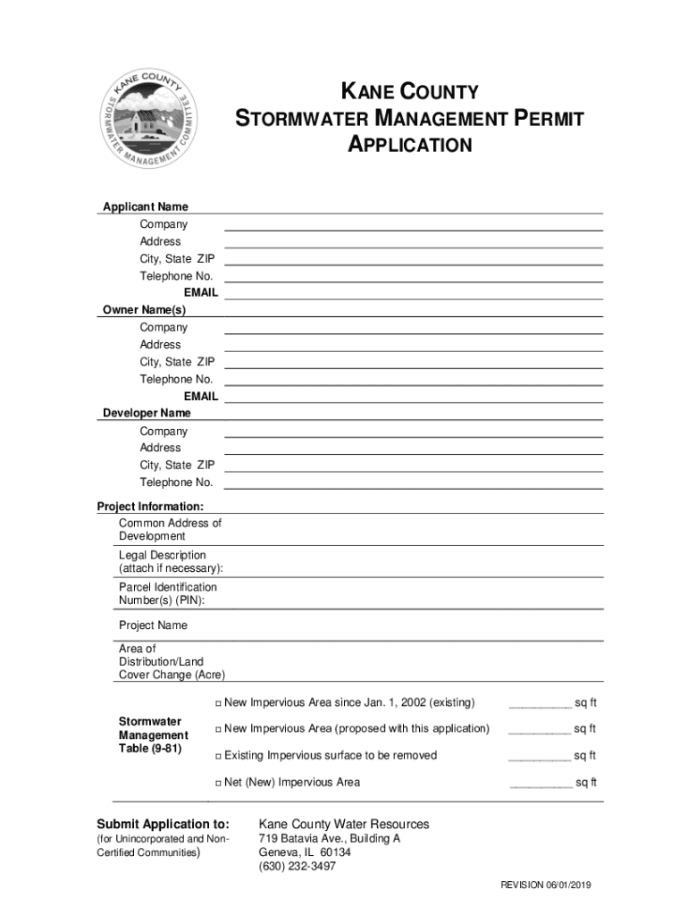 KANE COUNTY STORMWATER MANAGEMENT PERMIT APPLICATION Applicant Name Company Address City, State ZIP Telephone No. EMAIL Owner Name(s) Company Address City, State ZIP Telephone No. EMAIL Developer