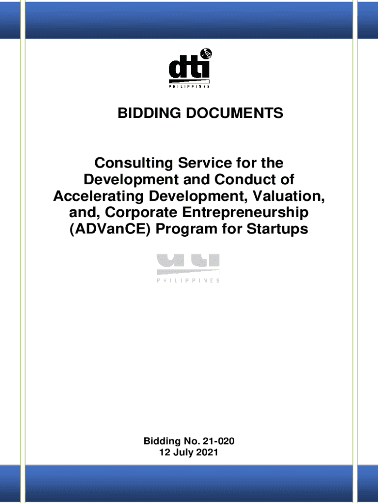 BIDDING DOCUMENTSConsulting Service for the Development and Conduct of Accelerating Development, Valuation, and, Corporate Entrepreneurship (Advance) Program for StartupsBidding No. 21020 12 July