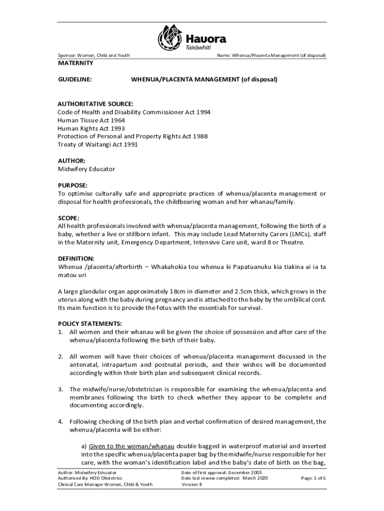Sponsor: Woman, Child and Youthquake: When/Placenta Management (of disposal)MATERNITY GUIDELINE:WHEN UA/PLACENTA MANAGEMENT (of disposal)AUTHORITATIVE SOURCE: Code of Health and Disability Commissioner