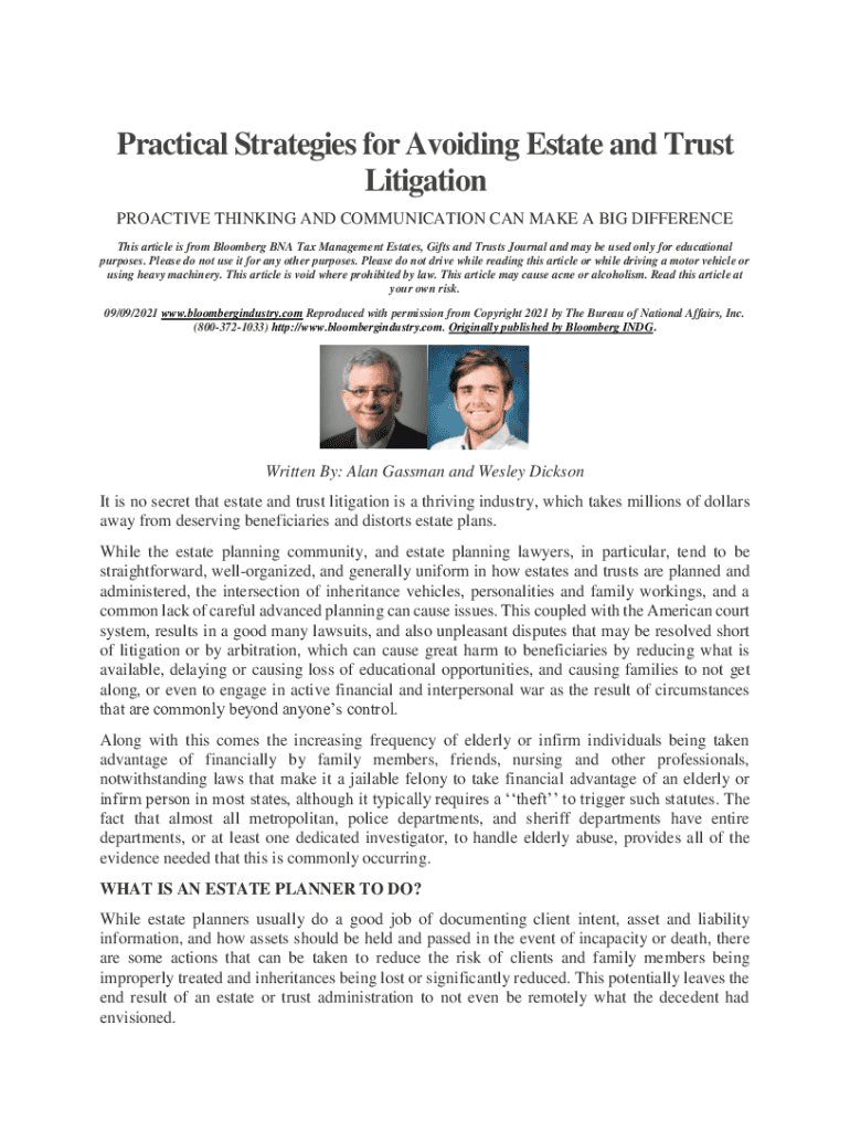 Practical Strategies for Avoiding Estate and Trust Litigation PROACTIVE THINKING AND COMMUNICATION CAN MAKE A BIG DIFFERENCE This article is from Bloomberg BNA Tax Management Estates, Gifts and Trusts