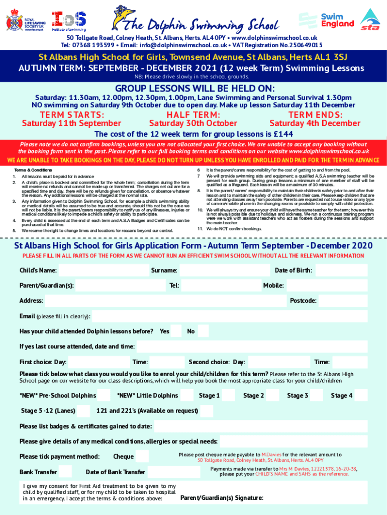 50 Tollgate Road, Conley Heath, St. Albany, Hearts. AL4 0PY www.dolphinswimschool.co.uk Tel: 07368 193599 Email: info@dolphinswimschool.co.uk VAT Registration No.250649015St Albany High School for