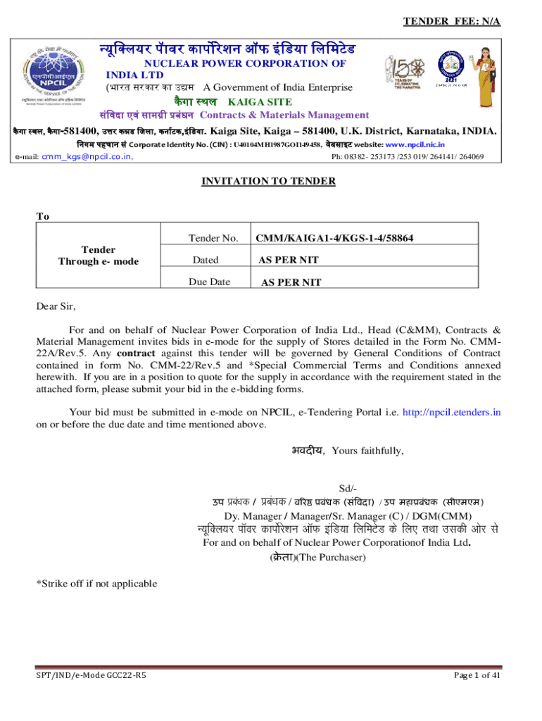 TENDER FEE: N/A NUCLEAR POWER CORPORATION OF INDIA LTD (A Government of India Enterprise TAIGA SITE Contracts & Materials Management, 581400,,,. Taiga Site, Taiga 581400, U.