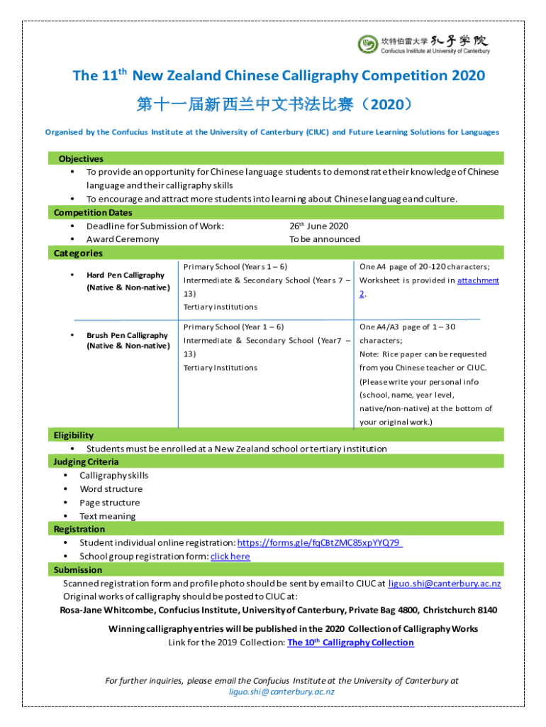 The 11th New Zealand Chinese Calligraphy Competition 2020 2020 Organized by the Confucius Institute at the University of Canterbury (CIC) and Future Learning Solutions for LanguagesObjectives To provide