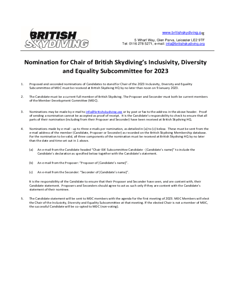 WWW.britishskydiving.org 5 Wharf Way, Glen Larva, Leicester LE2 9TF Tel: 0116 278 5271, email: info@britishskydiving.orgNomination for Chair of British Skydiving Inclusivity, Diversity and Equality