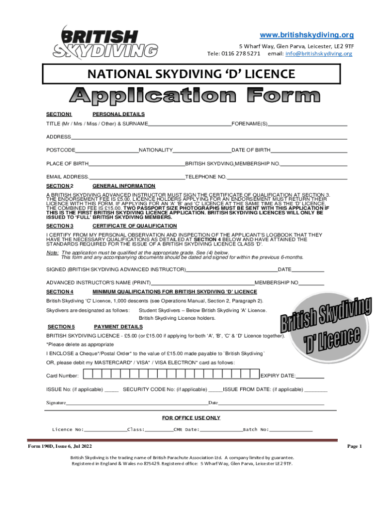 WWW.britishskydiving.org 5 Wharf Way, Glen Larva, Leicester, LE2 9TF Tell: 0116 278 5271 email: info@britishskydiving.orgNATIONAL SKYDIVING D License SECTION1PERSONAL DETAILSTITLE (Mr / Mrs / Miss