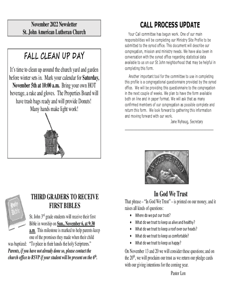 November 2022 Newsletter St. John American Lutheran Churchill CLEAN UP DAY It's time to clean up around the churchyard and garden before winter sets in. Mark your calendar for Saturday, November 5th