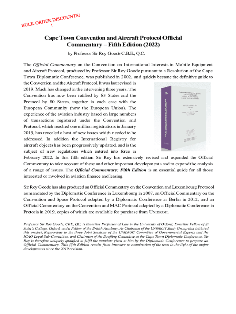 Cape Town Convention and Aircraft Protocol Official Commentary Fifth Edition (2022) by Professor Sir Roy Goode C.B.E., Q.C. The Official Commentary on the Convention on International Interests in