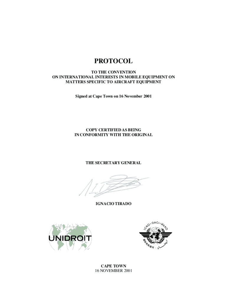 MATTERS SPECIFIC TO AIRCRAFT EQUIPMENTSigned at Cape Town on 16 November 2001COPY CERTIFIED AS BEING
