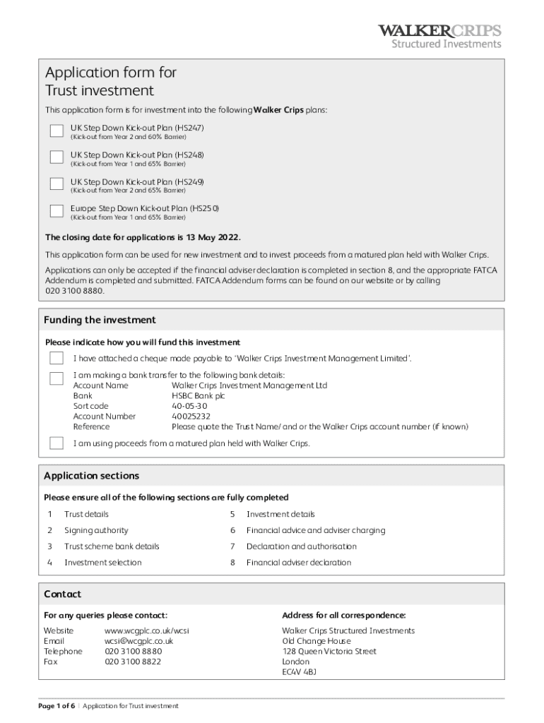 Application form for Trust investment This application form is for investment into the following Walker Crops plans: UK Step Down Sickout Plan (HS247) (Sickout from Year 2 and 60% Barrier)UK Step