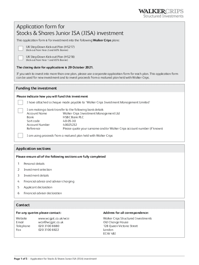 Application form for Stocks & Shares Junior ISA (LISA) investment This application form is for investment into the following Walker Crops plans: UK Step Down Sickout Plan (HS217) (Sickout from Year