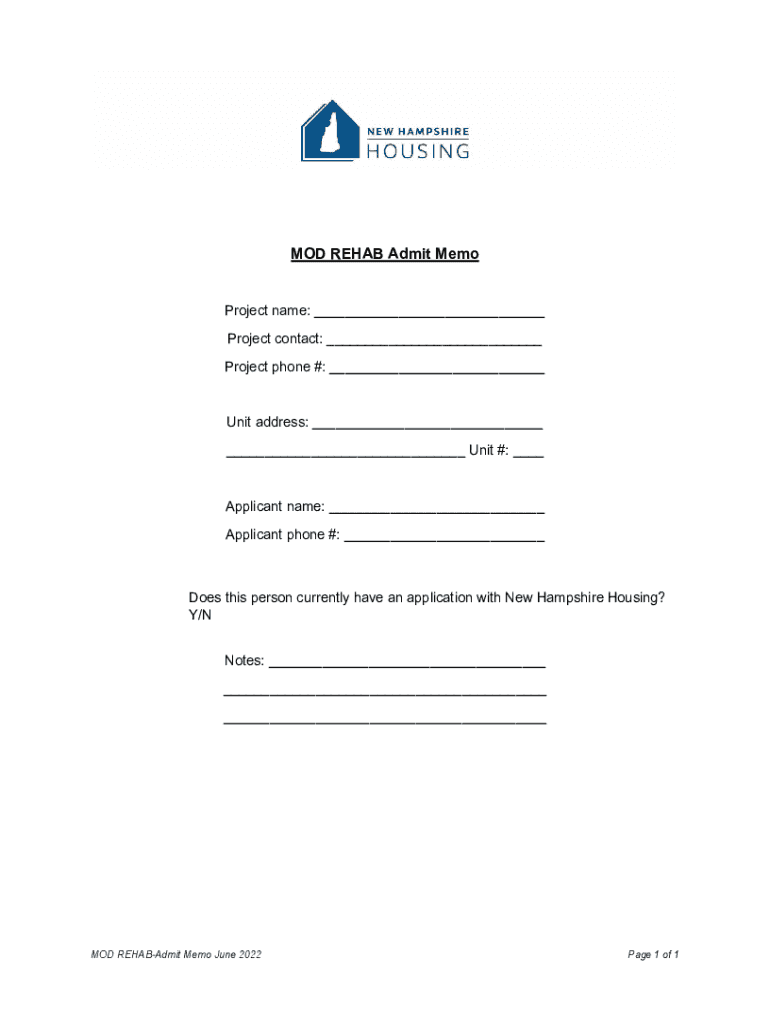 MOD REHAB Admit Memo Project name: ___ Project contact: ___ Project phone #: ___ Unit address: ___ ___ Unit #: ___ Applicant name: ___ Applicant phone #: ___Does this person currently have an application