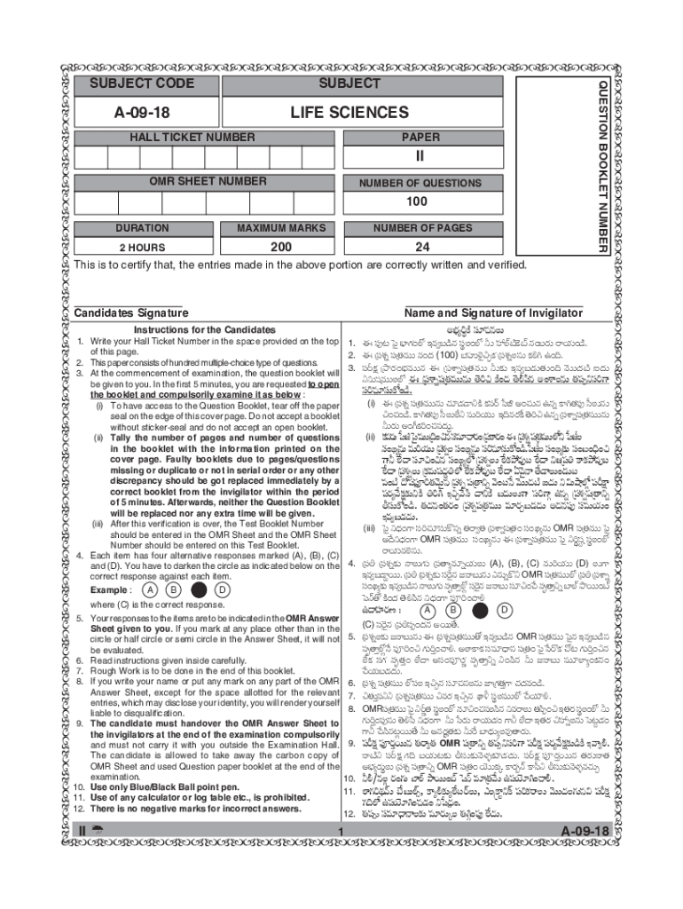 SubjectA0918life scienceshALL ticket number PaPERiiOMR Sheet Number OF qUESTIONS100 duration maximum mARKS2 outnumber OF pAGES20024This is to certify that, the entries made in the above portion are