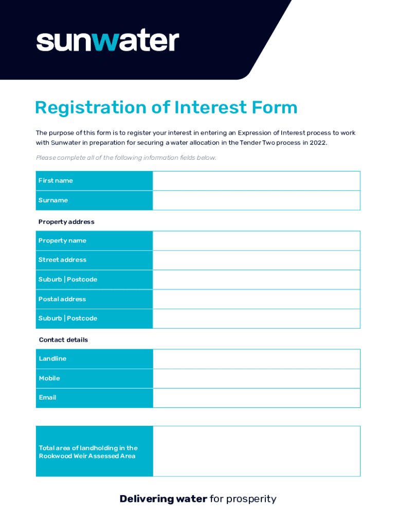 Registration of Interest Form The purpose of this form is to register your interest in entering an Expression of Interest process to work with Sun water in preparation for securing a water allocation
