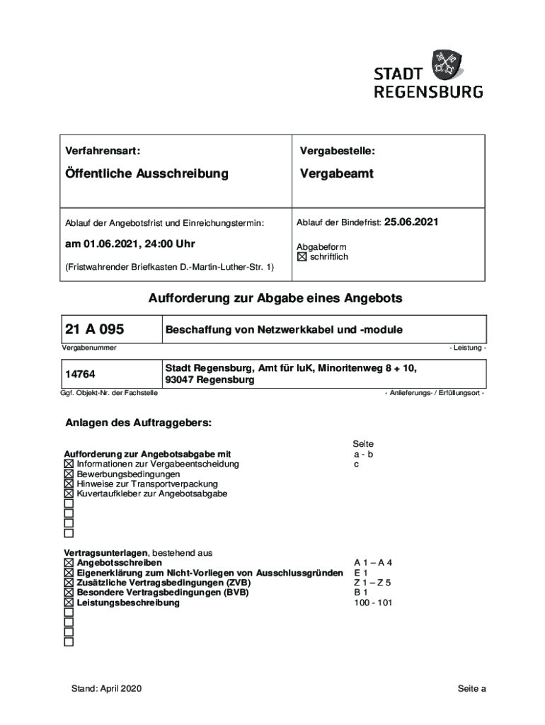 Verfahrensart:Vergabestelle:ffentliche AusschreibungVergabeamtAblauf her Angebotsfrist UND Einreichungstermin:Ablaze her Binders: 25.06.2021am 01.06.2021, 24:00 UhrAbgabeform