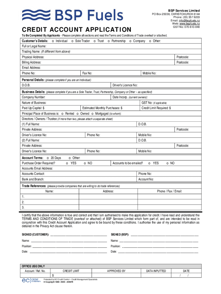 BSP Services Limited PO Box 25038, CHRISTCHURCH 8144 Phone: (03) 357 9203 Email: info@bspfuels.nz Web: www.bspfuels.nz GST No: 070613840CREDIT ACCOUNT Application Be Completed By Applicants Please