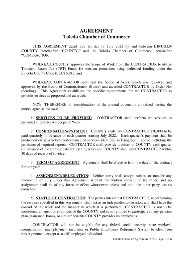 AGREEMENT Toledo Chamber of Commerce THIS AGREEMENT dated this 1st day of July 2022 by and between LINCOLN COUNTY, hereinafter COUNTY, and the Toledo Chamber of Commerce, hereinafter CONTRACTOR. WHEREAS,
