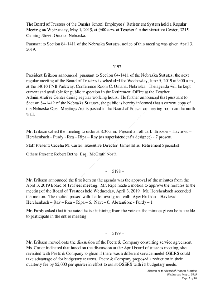 The Board of Trustees of the Omaha School Employees Retirement System held a Regular Meeting on Wednesday, May 1, 2019, at 9:00 a.m. at Teachers Administrative Center, 3215 Coming Street, Omaha, Nebraska.