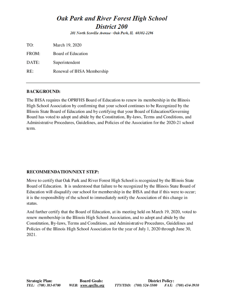 TO:March 19, 2020FROM:Board of Educational:Superintendent RE:Renewal of IHS MembershipBACKGROUND: The IHS requires the OPRAH Board of Education to renew its membership in the Illinois High School