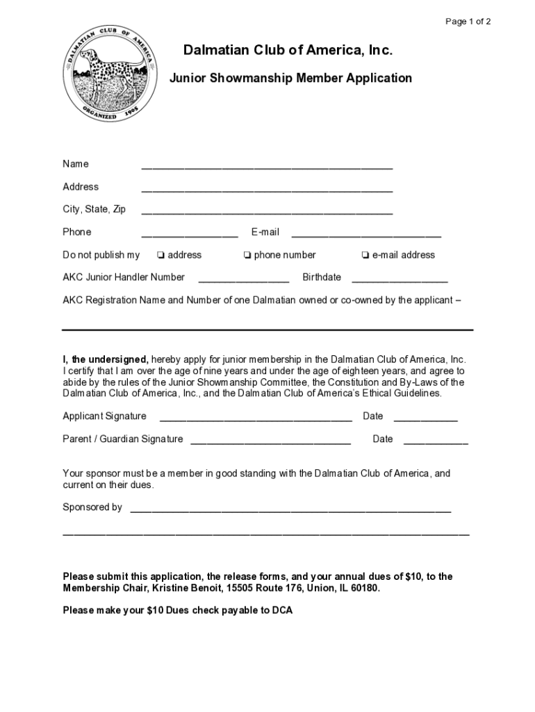 Page 1 of 2Dalmatian Club of America, Inc. Junior Showmanship Member ApplicationName___Address___City, State, Zip___Phone___Do not publish my address AKC Junior Handler NumberEmail___ phone number___Birthdate