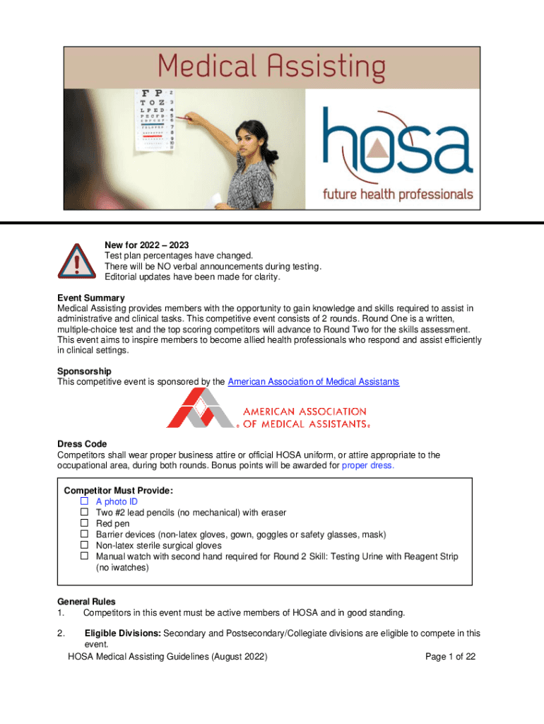 New for 2022 2023 Test plan percentages have changed. There will be NO verbal announcements during testing. Editorial updates have been made for clarity. Event Summary Medical Assisting provides members