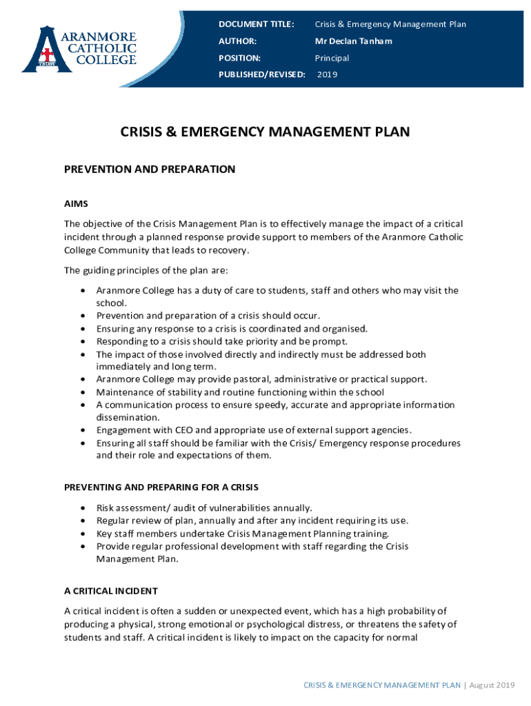DOCUMENT TITLE:Crisis & Emergency Management PlanAUTHOR:Mr Declan TanhamPOSITION:PrincipalPUBLISHED/REVISED:2019CRISIS & EMERGENCY MANAGEMENT PLAN