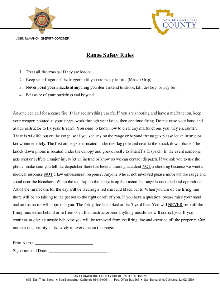 JOHN McMahon, SHERIFFCORONERRange Safety Rules 1. Treat all firearms as if they are loaded. 2. Keep your finger off the trigger until you are ready to fire. (Master Grip) 3. Never point your muzzle