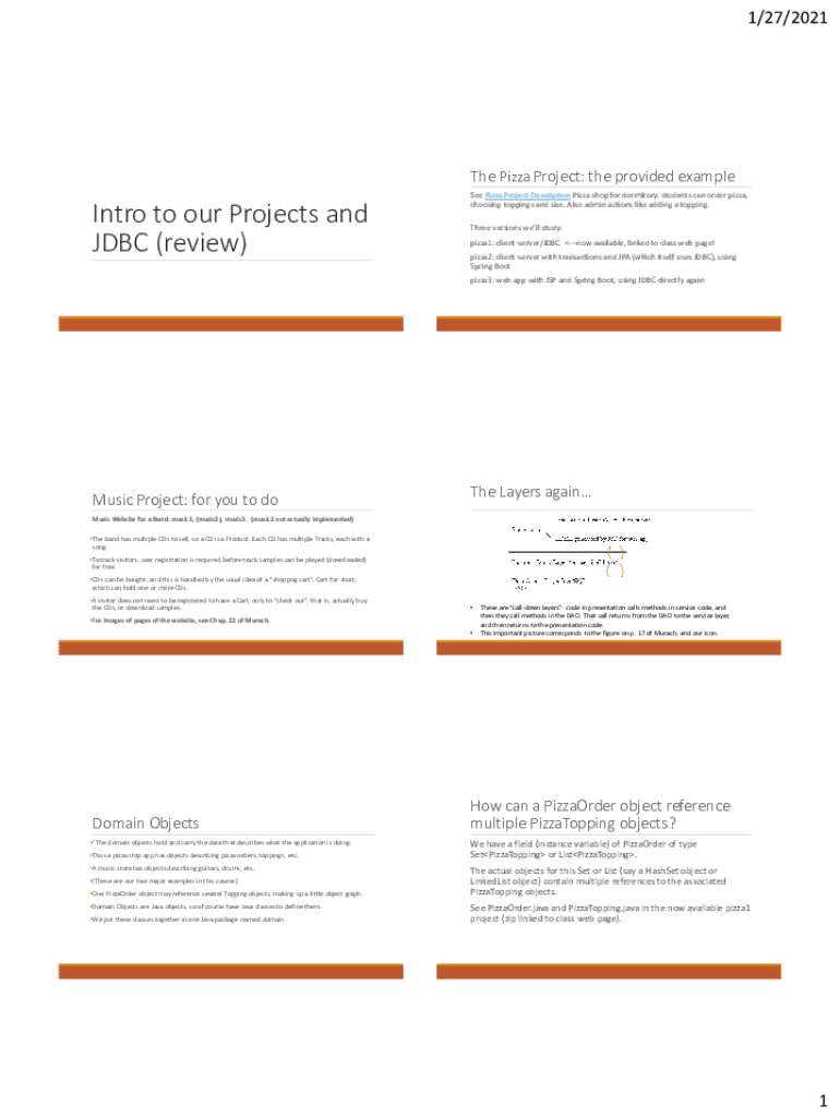1/27/2021The Pizza Project: the provided exampleIntro to our Projects and JDBC (review)See Pizza Project Description Pizza shop for dormitory: students can order pizza, choosing toppings and size.