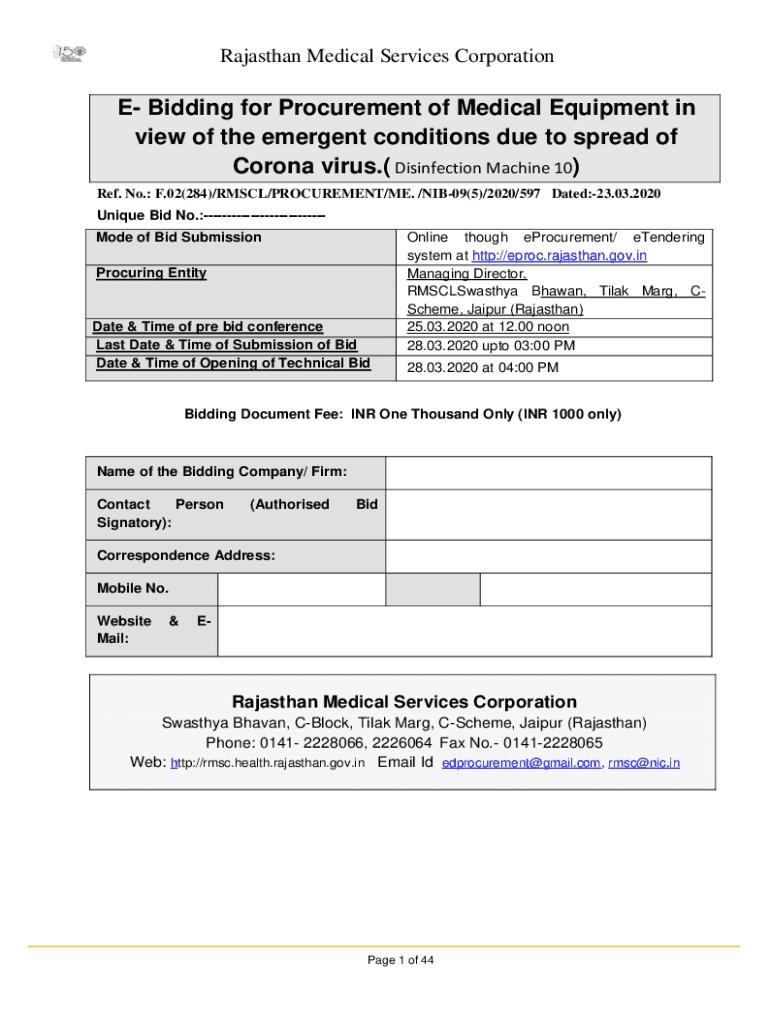Rajasthan Medical Services Corporation Bidding for Procurement of Medical Equipment in view of the emergent conditions due to spread of Coronavirus.(Disinfection Machine 10) Ref. No.: F.02(284)/RM