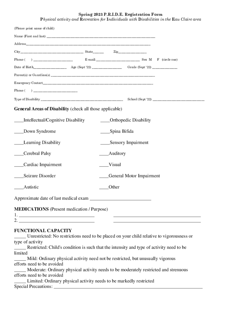 Spring 2023 P.R.I.D.E. Registration Form Physical activity and Recreation for Individuals with Disabilities in the Eau Claire area (Please print name of child) Name (First and last) ___ Address___