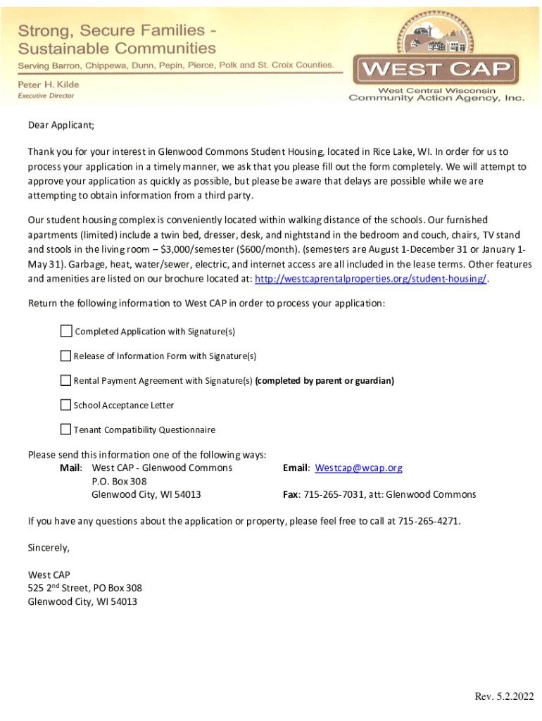 Dear Applicant; Thank you for your interest in Glenwood Commons Student Housing, located in Rice Lake, WI. In order for us to process your application in a timely manner, we ask that you please fill