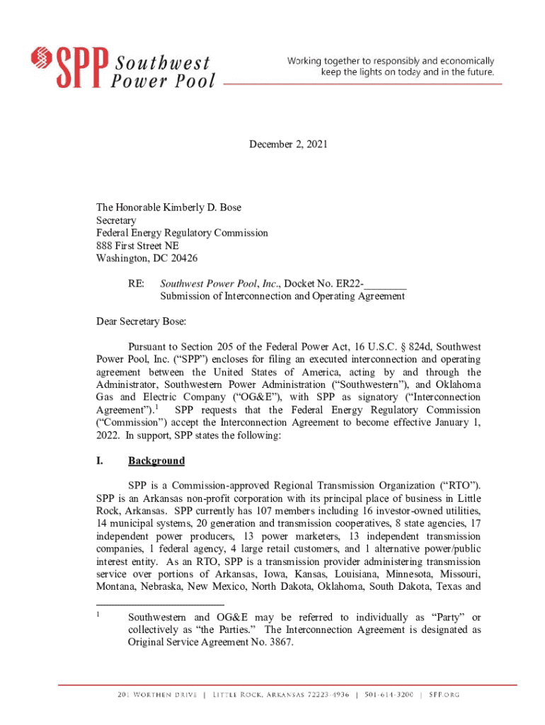 December 2, 2021The Honorable Kimberly D. Bose Secretary Federal Energy Regulatory Commission 888 First Street NE Washington, DC 20426 RE:Southwest Power Pool, Inc., Docket No. ER22___ Submission