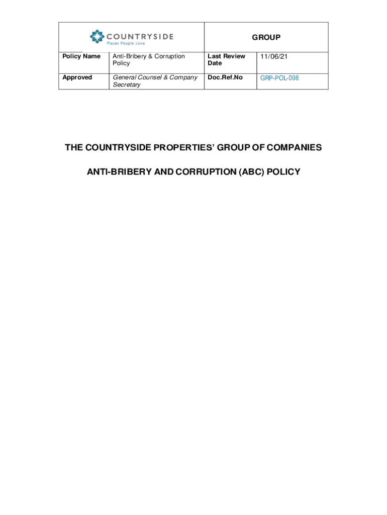 GROUP Policy NameAntiBribery & Corruption PolicyMap Review Date11/06/21ApprovedGeneral Counsel & Company Secretary. Ref.NoGRPPOL008THE COUNTRYSIDE PROPERTIES GROUP OF COMPANIES ANTIBRIBERY AND CORRUPTION