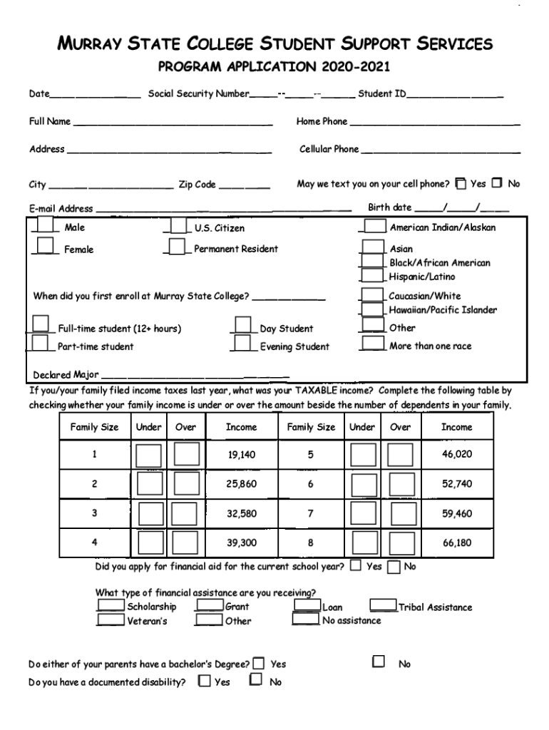 MURRAY STATE COLLEGE STUDENT SUPPORT SERVICES PROGRAM APPLICATION 20202021 Date___ _ Social Security Number__ ___ Student ID___ Full Name ___Home Phone ___Address ___Cellular Phone ___City ___ Zip