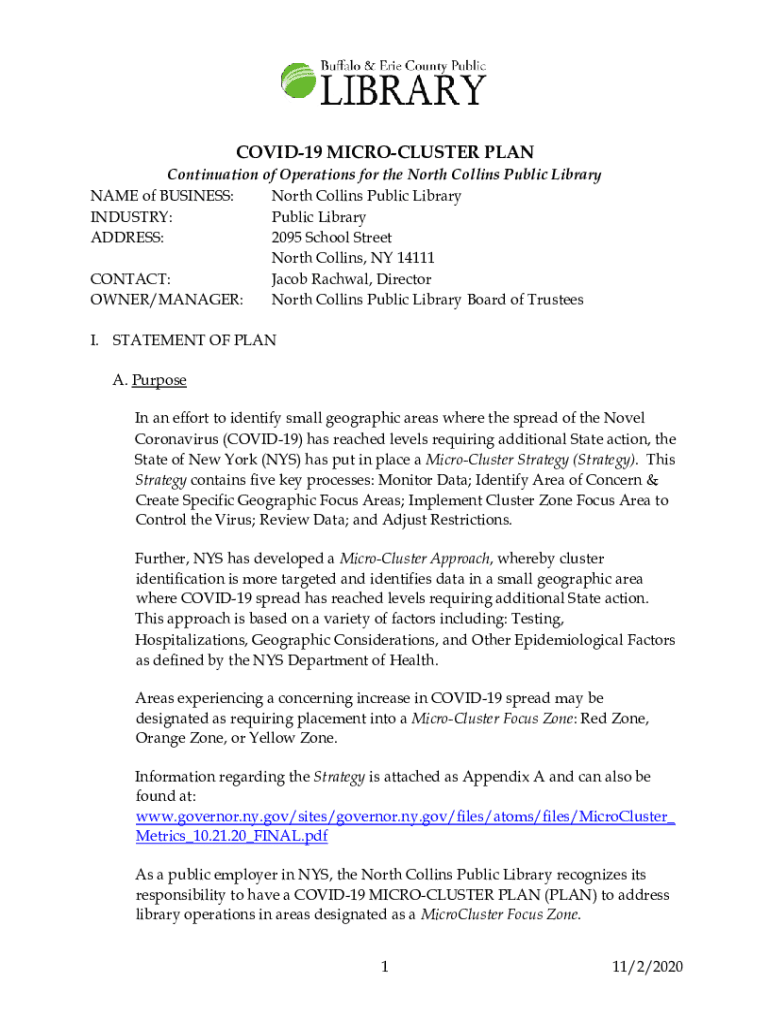 COVID-19 MICROLITER PLAN Continuation of Operations for the North Collins Public Library NAME of BUSINESS: North Collins Public Library INDUSTRY: Public Library ADDRESS: 2095 School Street North Collins,