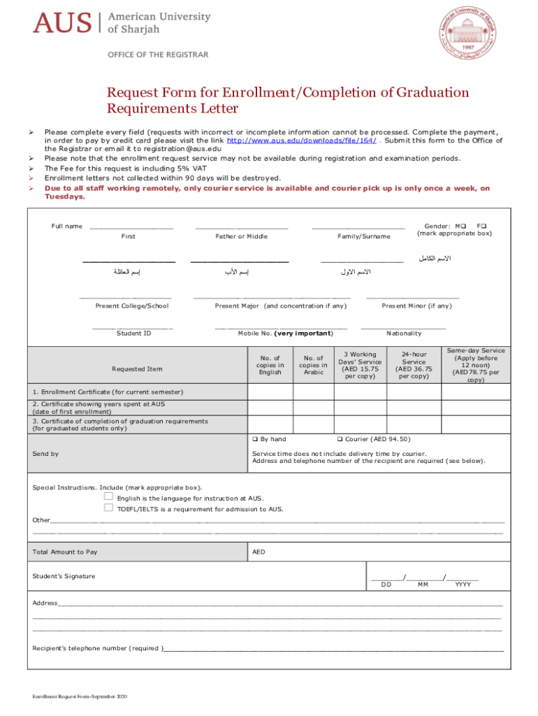 Request Form for Enrollment/Completion of Graduation Requirements Letter Please complete every field (requests with incorrect or incomplete information cannot be processed. Complete the payment, in