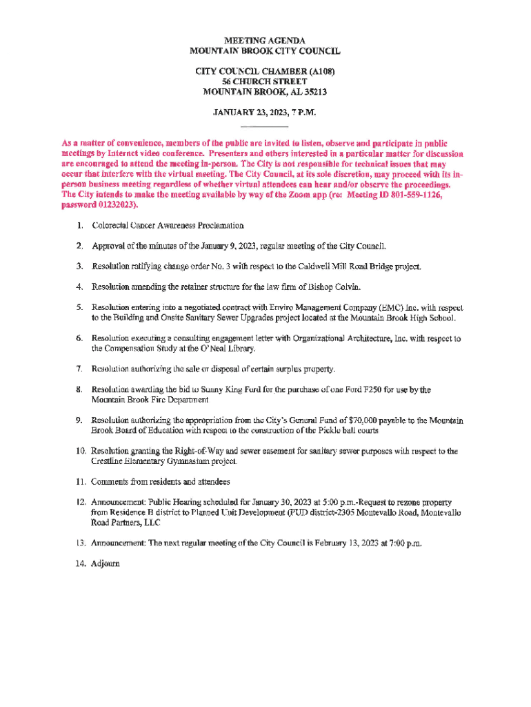 MEETING AGENDA MOUNTAIN BROOK CITY COUNCIL CHAMBER (A108) 56 CHURCH STREET MOUNTAIN BROOK, AL 35213 JANUARY 23, 2023:7 P.M. As a matter of convenience, members of the public are invited to listen,