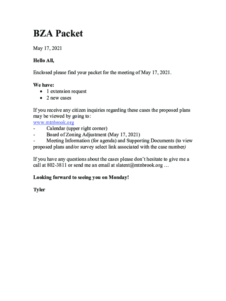 BZA Packet May 17, 2021, Hello All, Enclosed please find your packet for the meeting of May 17, 2021. We have: 1 extension request 2 new cases If you receive any citizen inquiries regarding these