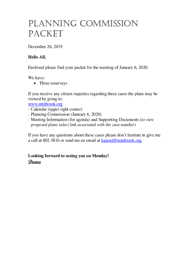PLANNING COMMISSION PACKET December 26, 2019, Hello All, Enclosed please find your packet for the meeting of January 6, 2020. We have: Three resurveys If you receive any citizen inquiries regarding