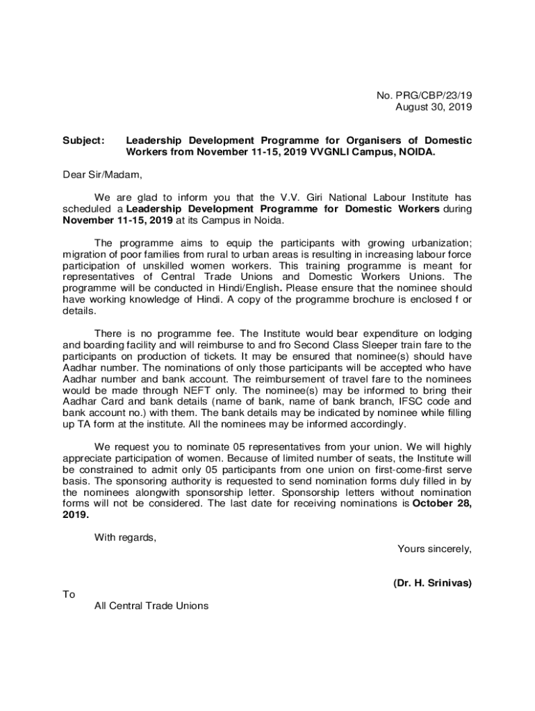 No. PRG/CBP/23/19 August 30, 2019Subject:Leadership Development Program for Organizers of Domestic Workers from November 1115, 2019 EVENLY Campus, NOIDA. Dear Sir/Madam, We are glad to inform you
