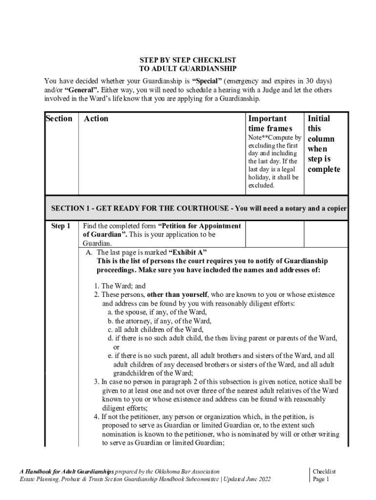 STEP BY STEP CHECKLIST TO ADULT GUARDIANSHIP You have decided whether your Guardianship is Special (emergency and expires in 30 days) and/or General. Either way, you will need to schedule a hearing