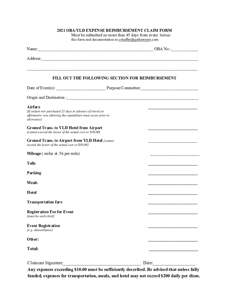 2021 CBA/OLD EXPENSE REIMBURSEMENT CLAIM FORM Must be submitted no more than 45 days from event. Submit this form and documentation to cshaffer@gablawyers.comName:___ CBA No.:___ Address:___ ___ FILL