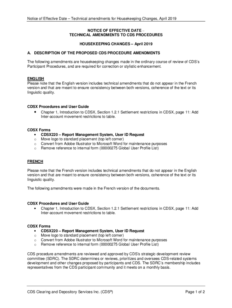 Notice of Effective Date Technical amendments for Housekeeping Changes, April 2019 NOTICE OF EFFECTIVE DATE TECHNICAL AMENDMENTS TO CDS PROCEDURES HOUSEKEEPING CHANGES April 2019 A. DESCRIPTION OF