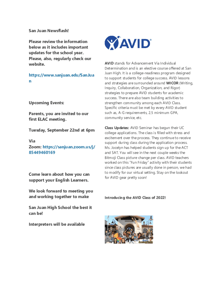 San Juan Newsflash! Please review the information below as it includes important updates for the school year. Please, also, regularly check our website. https://www.sanjuan.edu/SanJua upcoming Events: