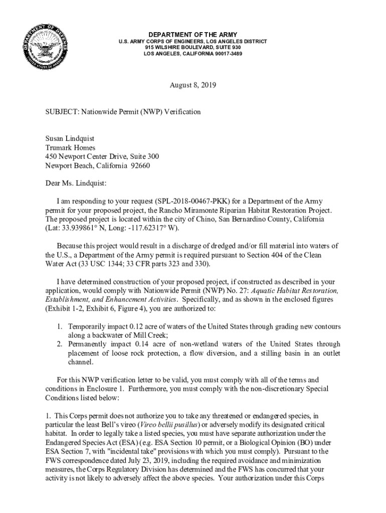 DEPARTMENT OF THE ARMY U.S. ARMY CORPS OF ENGINEERS, LOS ANGELES DISTRICT 915 WILSHIRE BOULEVARD, SUITE 930 LOS ANGELES, CALIFORNIA 900173489August 8, 2019 SUBJECT: Nationwide Permit (NP) Verification